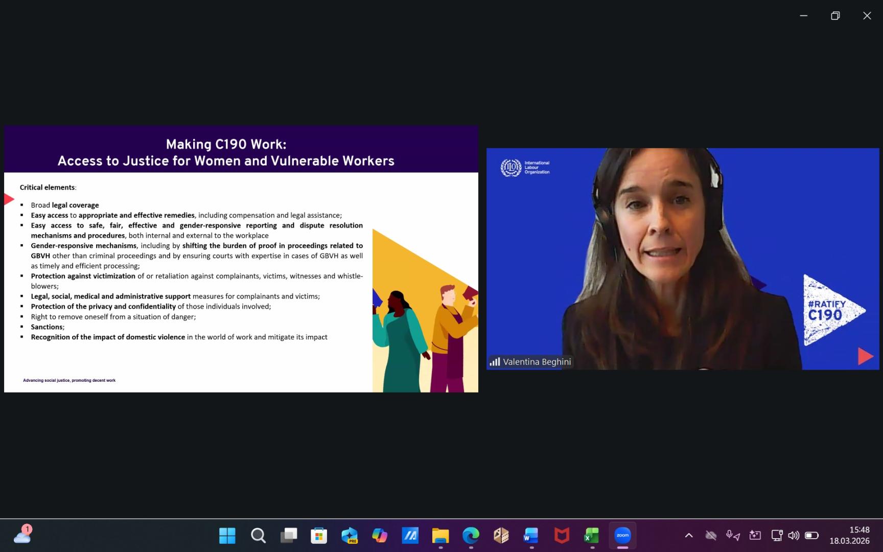 Konuşmada ayrıca, ILO 190 sayılı Sözleşme’nin yalnızca onaylanmasının değil, etkin uygulanmasının ve denetlenmesinin kritik önemde olduğunu vurguladı.